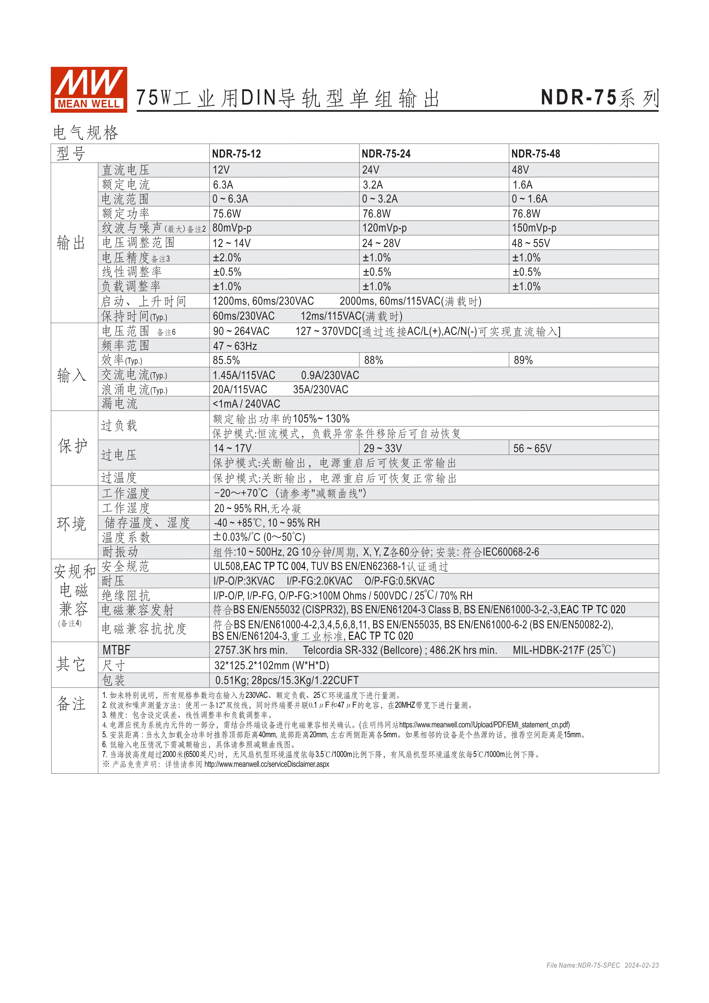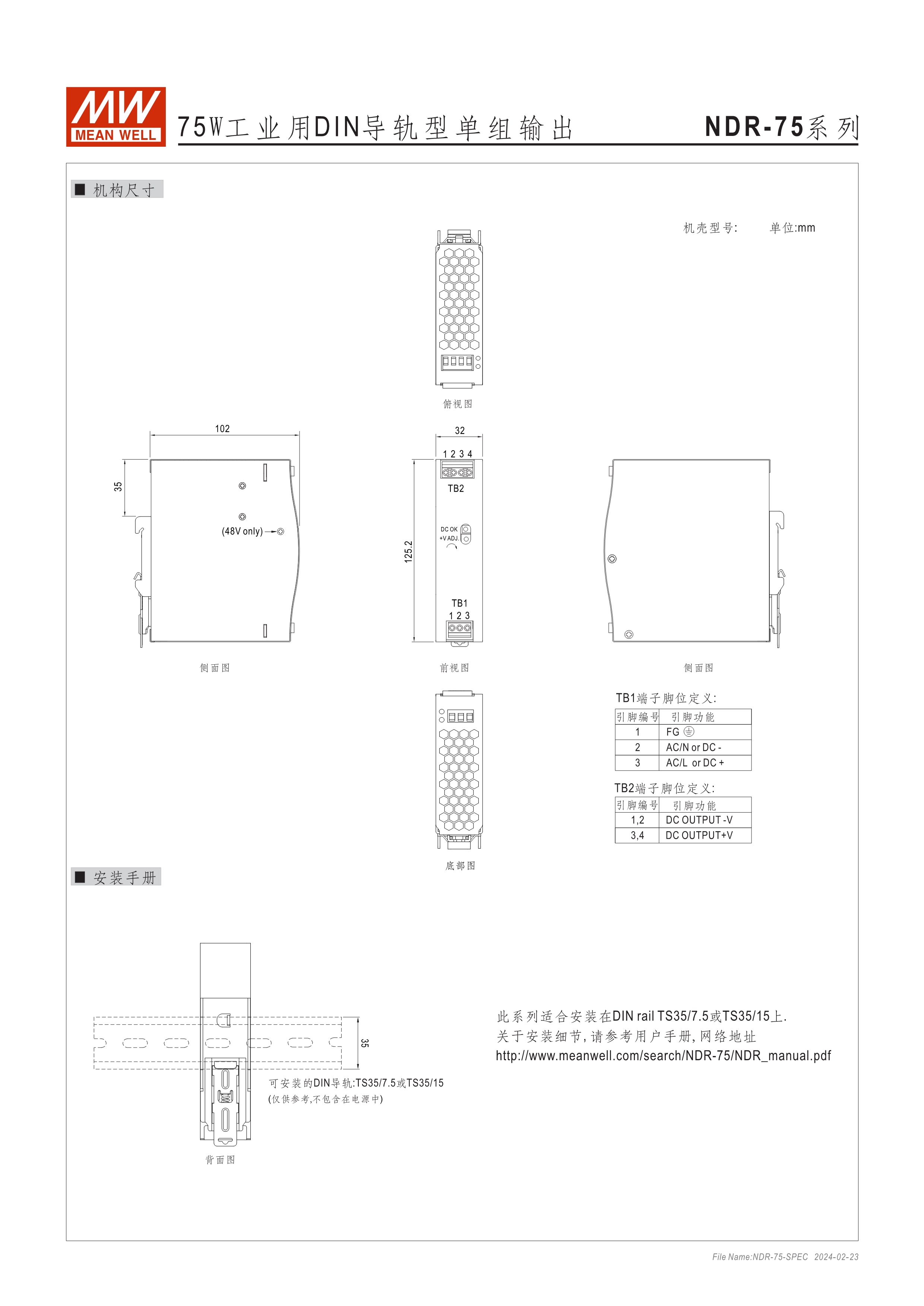 金屬殼,經(jīng)濟款 單相, 90~264Vac, 全范圍輸入 窄面寬設(shè)計:32~85.5mm EMC EN55022 class B 適合安裝于DIN rail TS-35 / 7.5或15 3年保固期