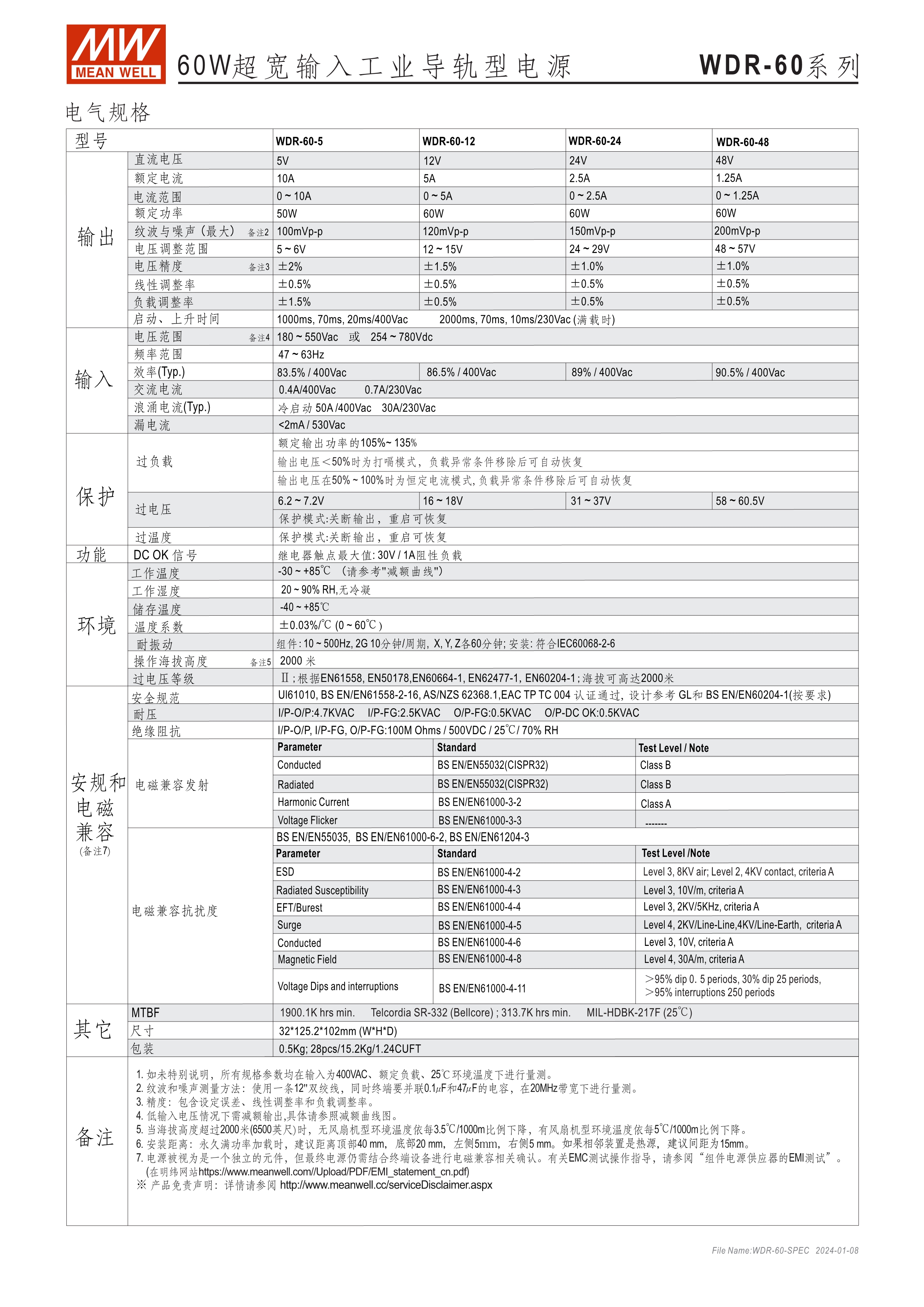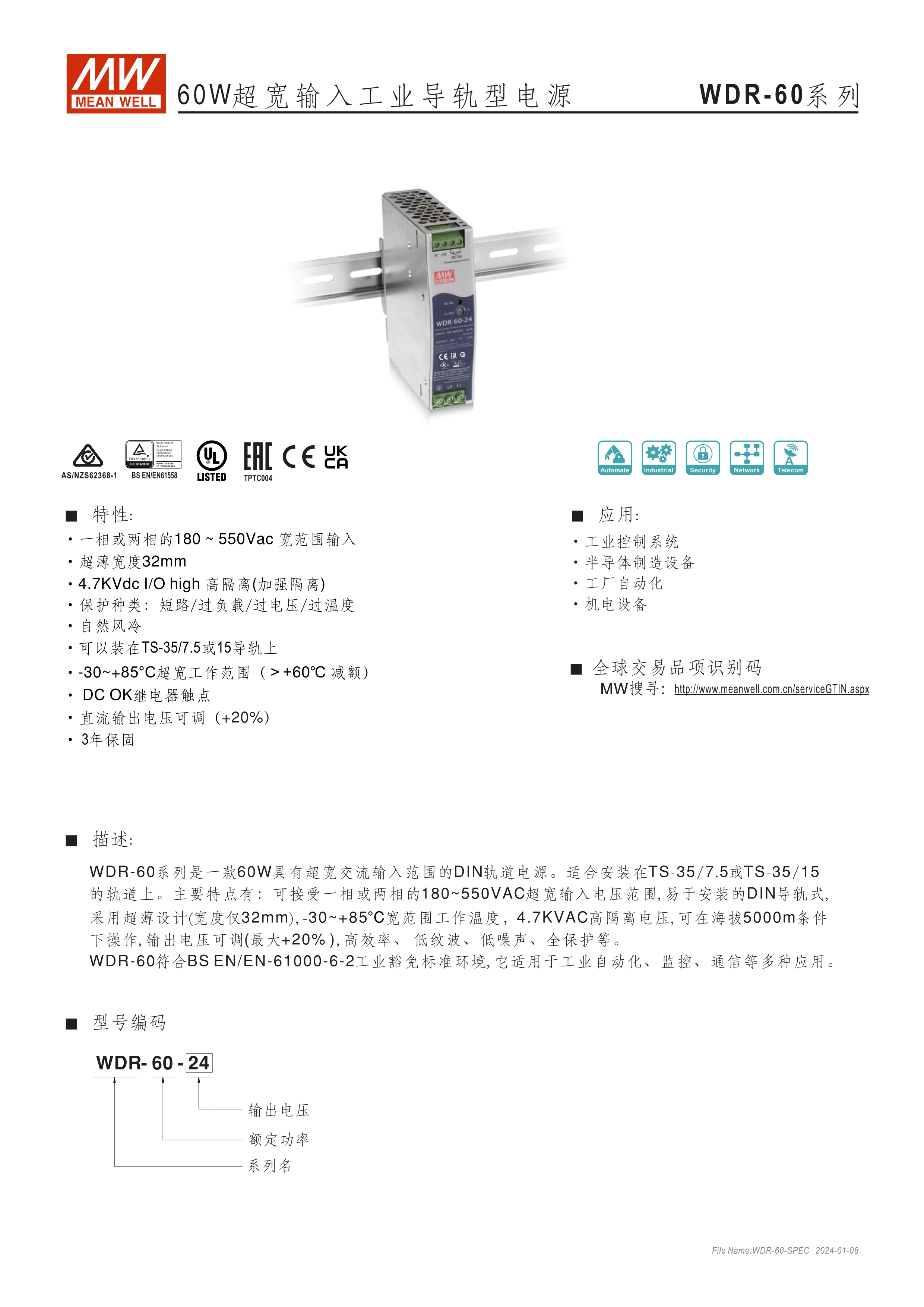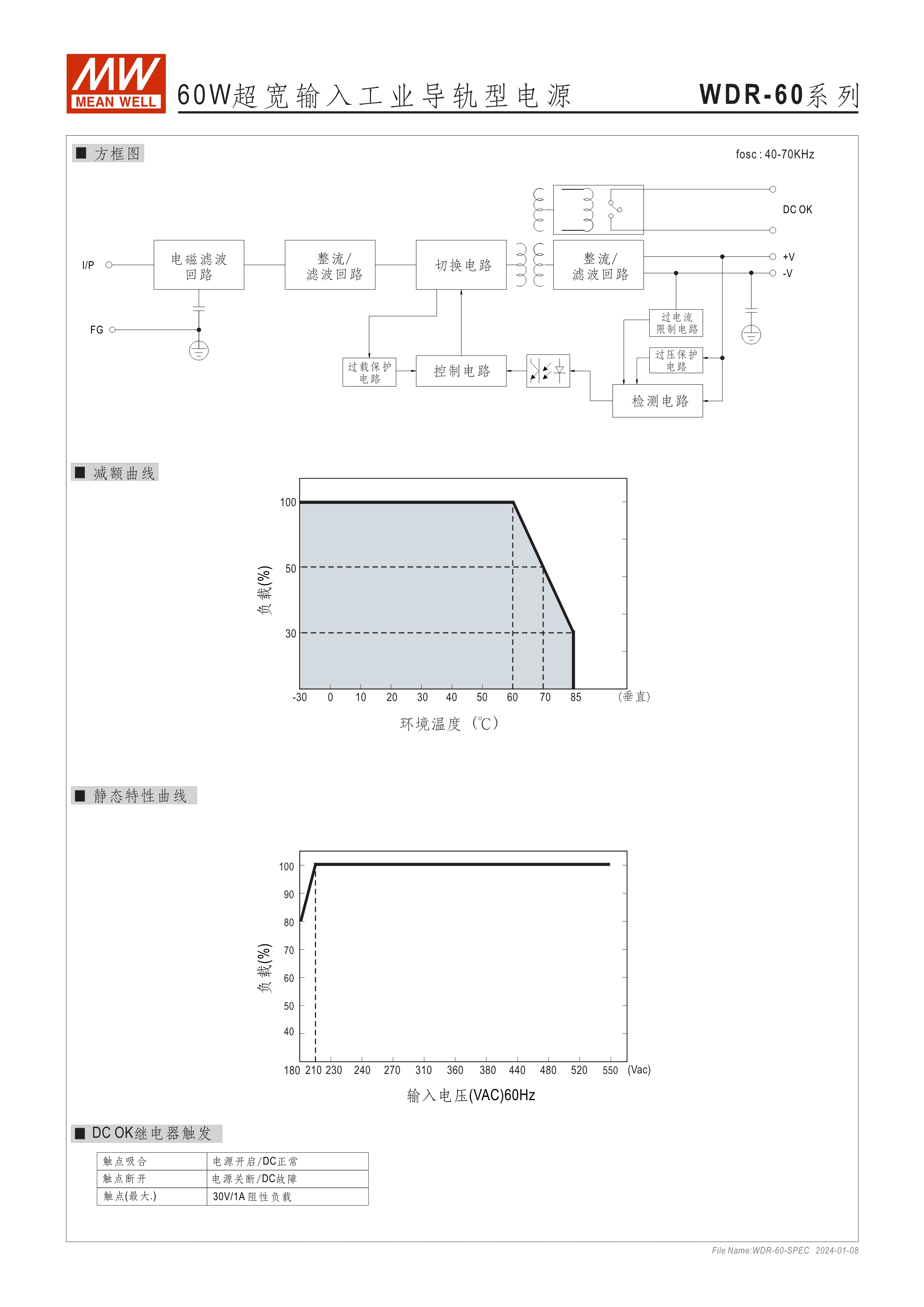 金屬殼,薄型設計 單相及雙相, 180~550VAC寬輸入范圍 高工作效率達93% 240W及480W內建主動式功率因子矯正功能(active PFC) 適合安裝于DIN rail TS-35 / 7.5 或 15 內建DC OK繼電器接點(Relay contact)