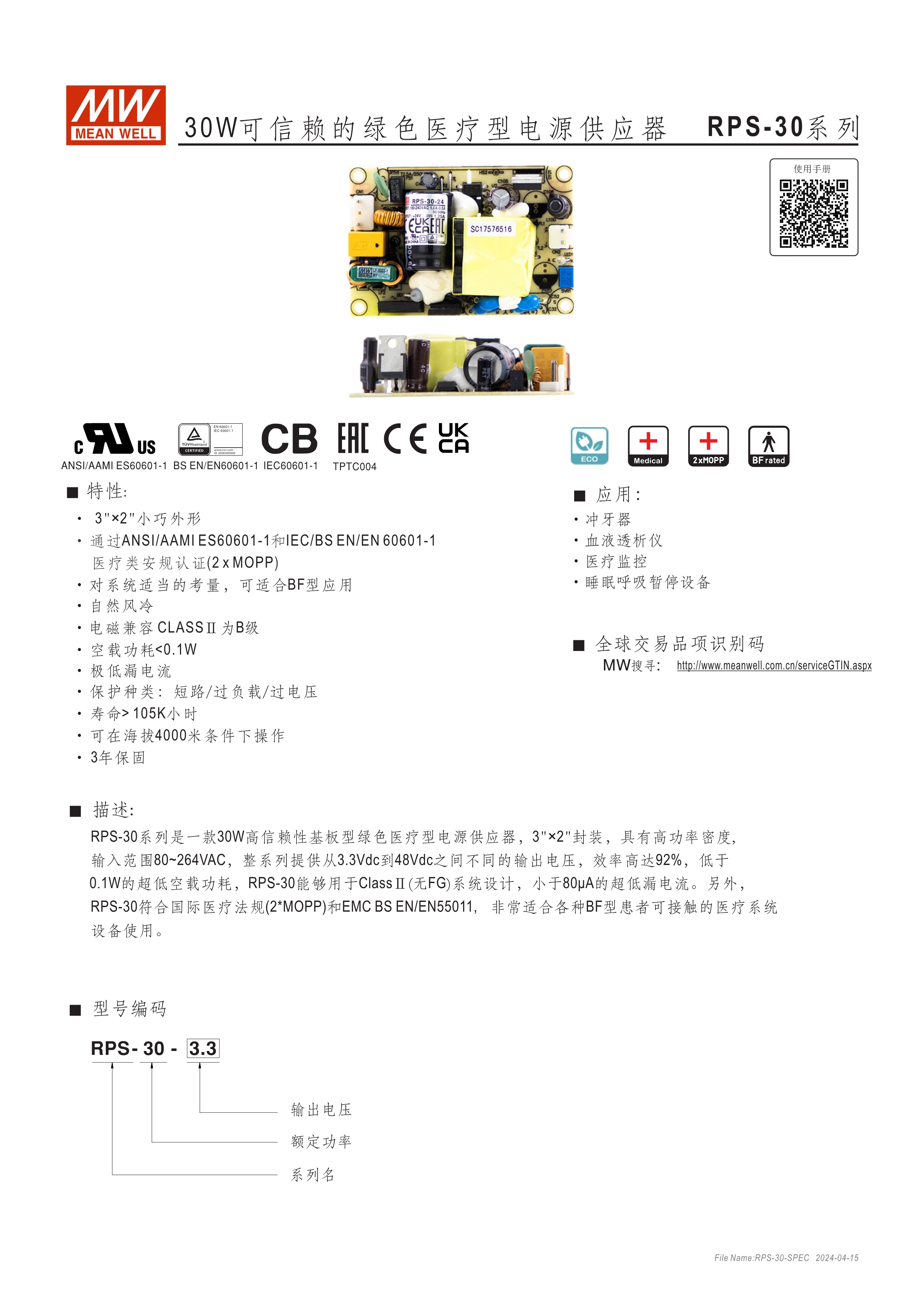 小型化尺寸 PCB式,小瓦數(shù)機(jī)型無功率因子矯正功能(PFC) 通過醫(yī)療類安規(guī)認(rèn)證(2xMOPP) 低泄漏電流,適合用于非病患接觸式醫(yī)療設(shè)備 特定機(jī)型在適當(dāng)系統(tǒng)條件下,適合用于BF應(yīng)用