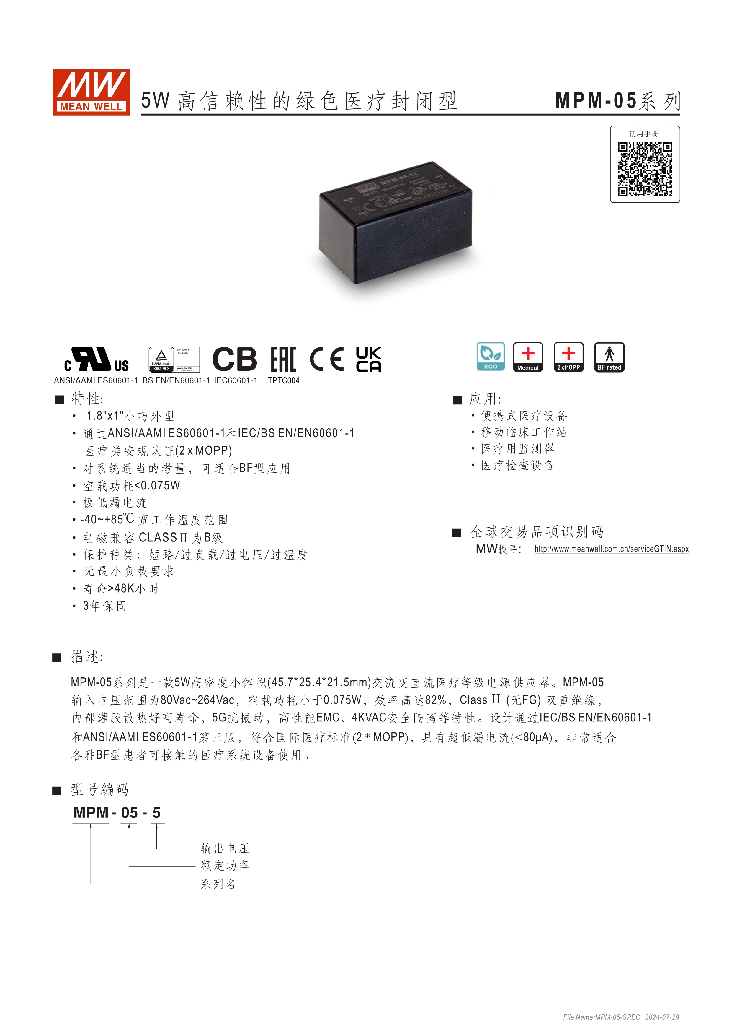 安裝于終端設備之PCB上 通過醫(yī)療類安規(guī)認證 (2xMOPP) 在適當系統(tǒng)條件下,適合用于BF應用