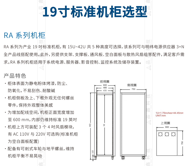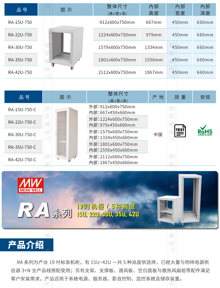 RA系列明緯聯(lián)源精密19寸標(biāo)準(zhǔn)機(jī)柜電源機(jī)柜15U~42U5種高度