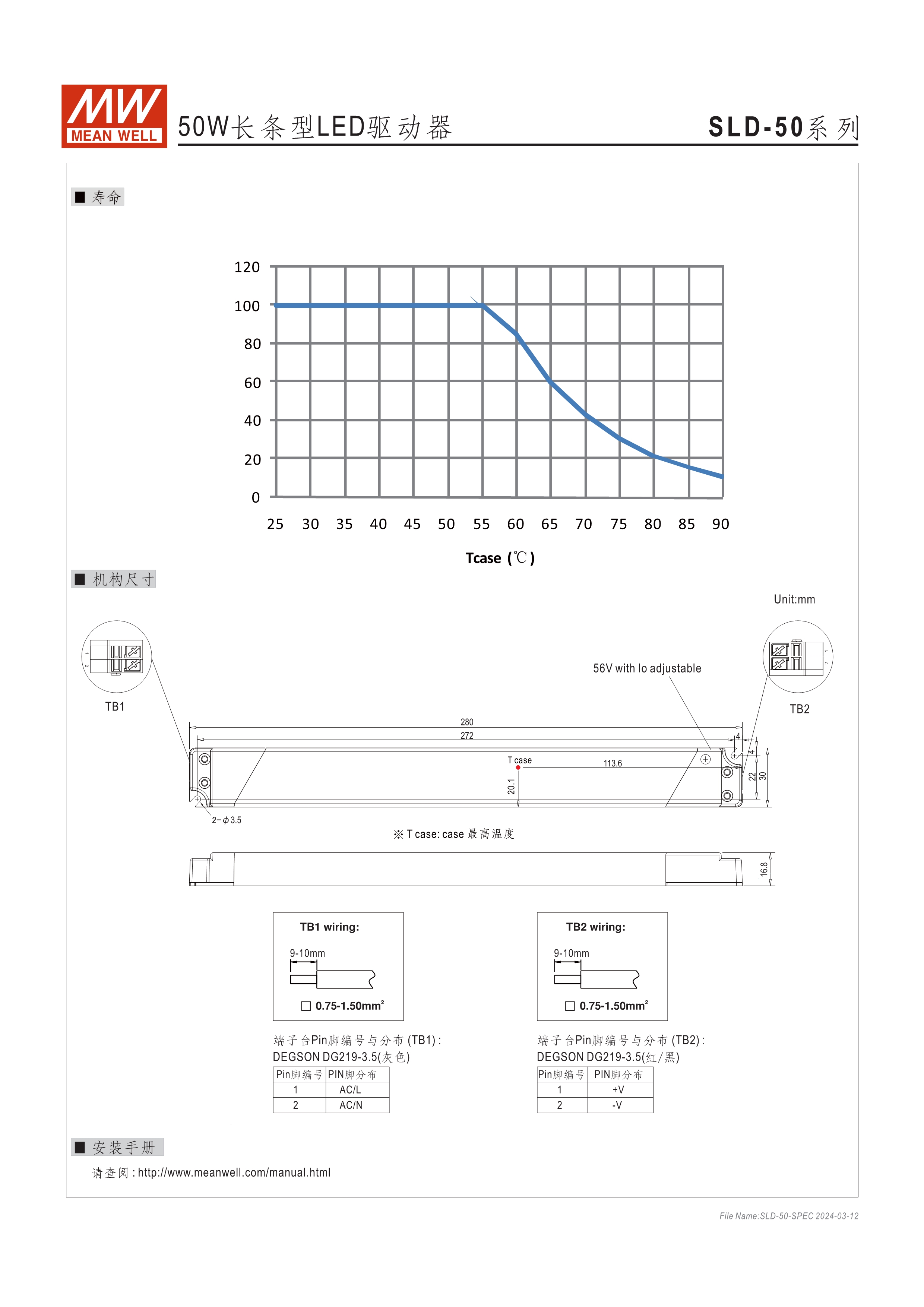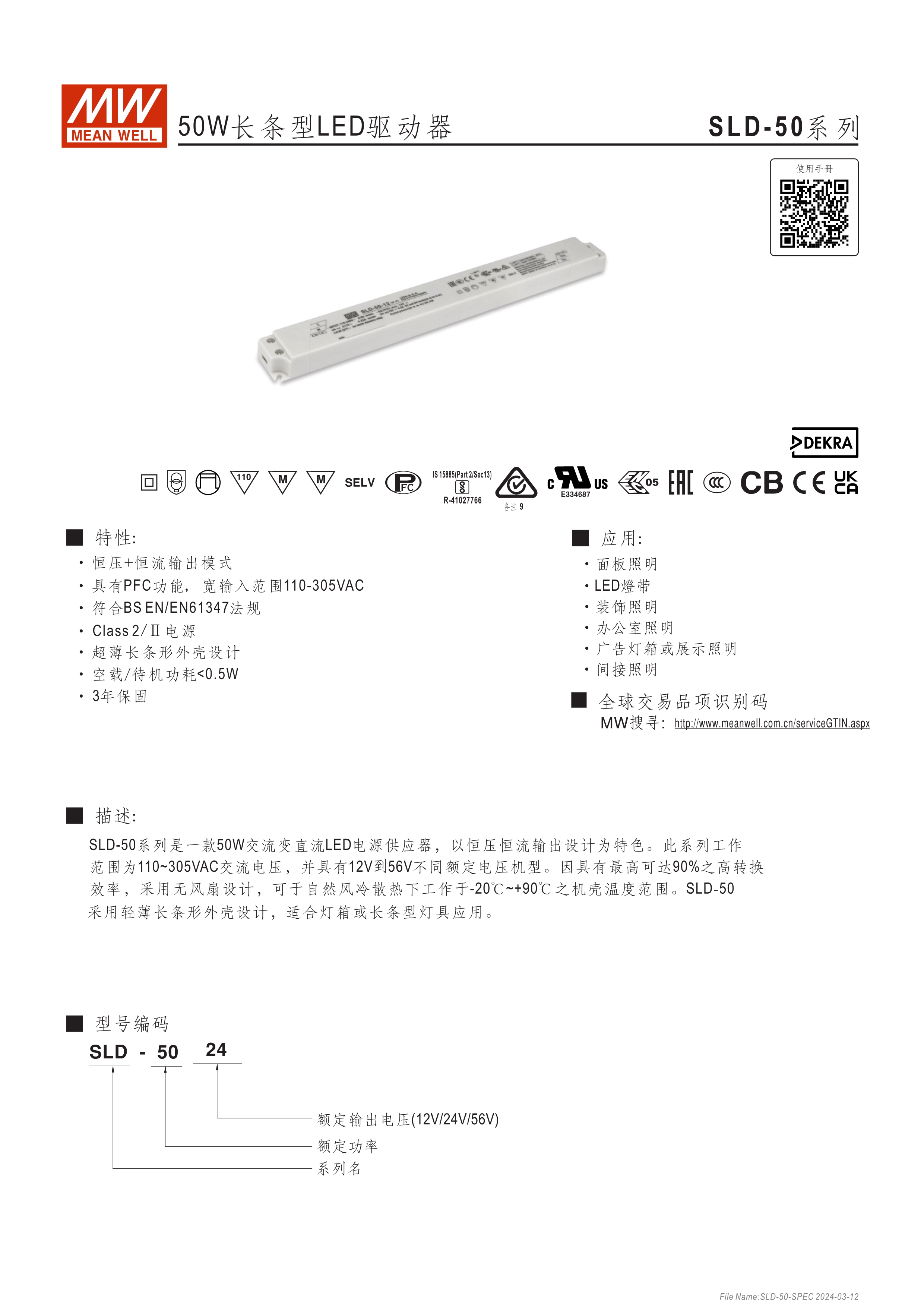 寬電壓輸入范圍110~305VAC (SLD-150為120~305VAC) 超薄(16.8mm)長條型尺寸 主動式PFC設(shè)計及輸出效率可達90% (SLD-150效率可達93%) 符合class 2/II 設(shè)計及SELV 保護功能:短路、過電壓、過溫度 3年保固 (SLD-150為5年保固)
