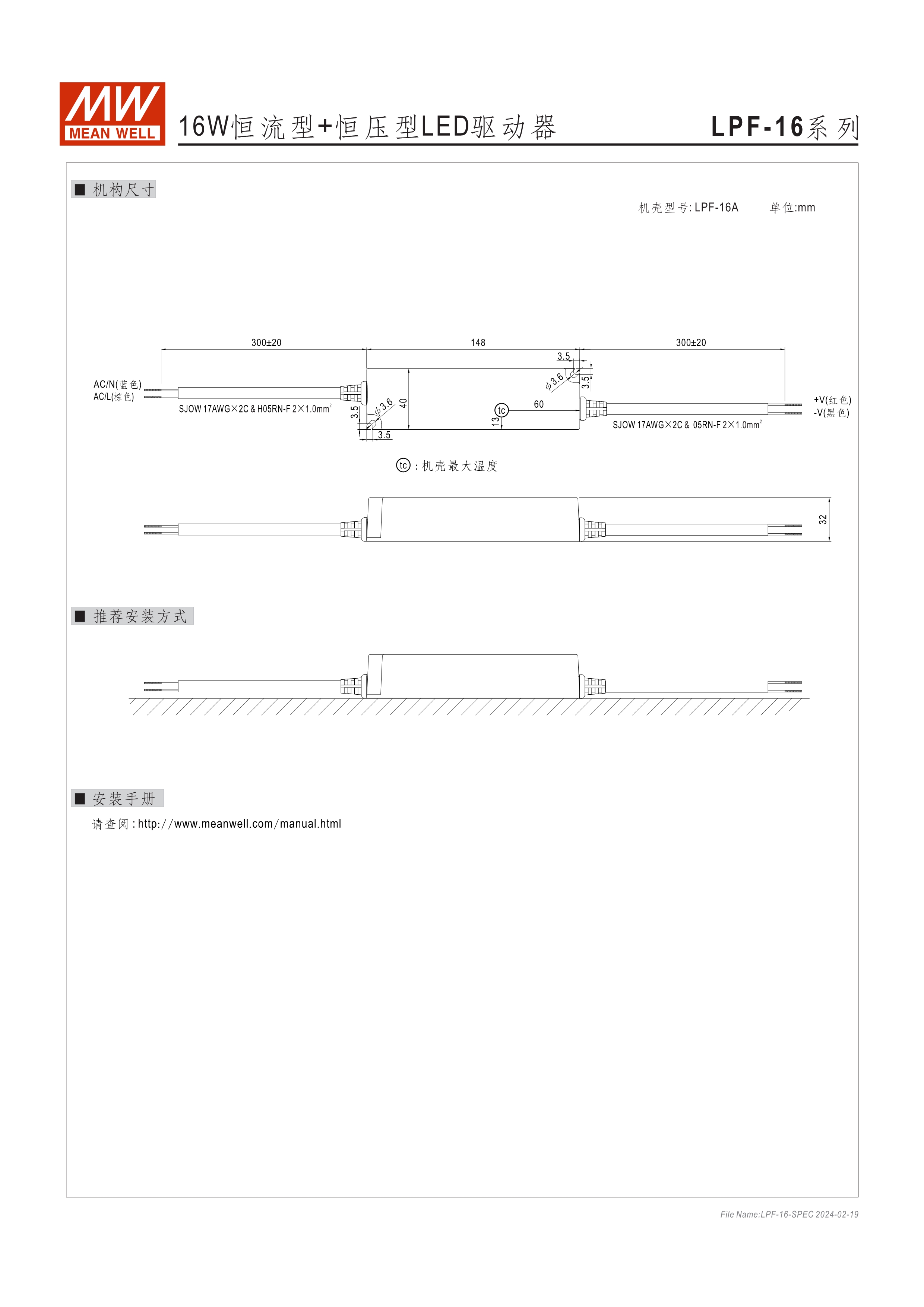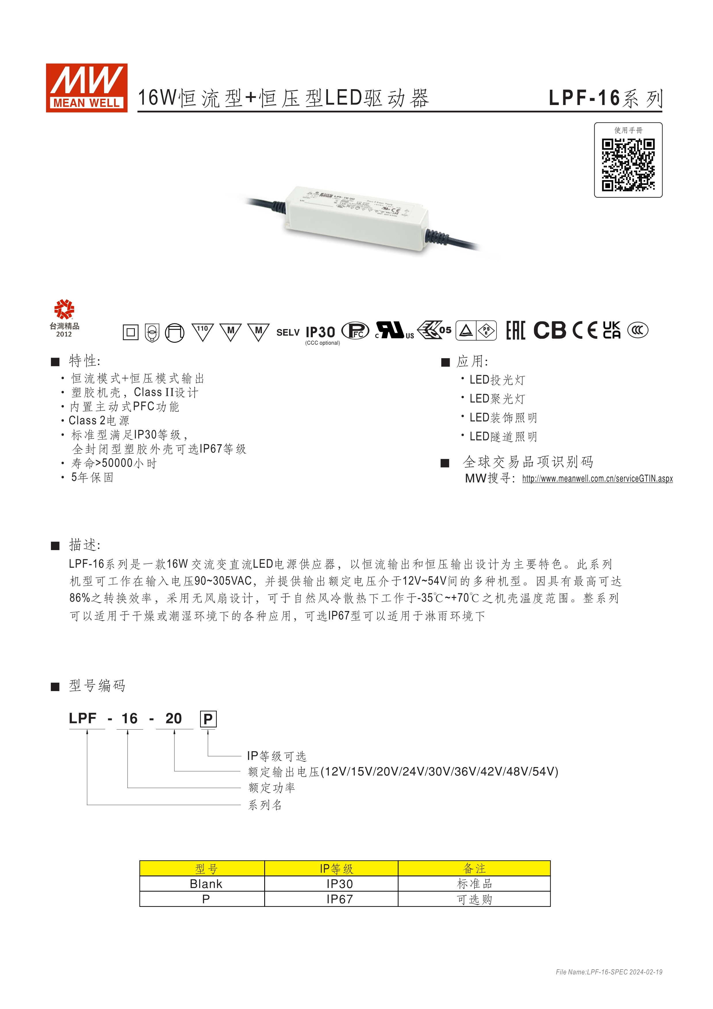 90~305VAC交流輸入, 內(nèi)建主動(dòng)式功率因子矯正功能(active PFC) 塑料外殼,IP67防護(hù)等級(jí)(16W需選購(gòu)) Class II設(shè)計(jì),無FG D type 機(jī)種內(nèi)建三合一調(diào)光功能(1~10VDC,PWM信號(hào)或電阻) Type "HL" LED電源適用在安裝于Class I, Division 2 類 危險(xiǎn)地點(diǎn)之照明燈具(LPF-90/90D) 適合于LED照明及LED電子廣告牌相關(guān)應(yīng)用 5年保固期