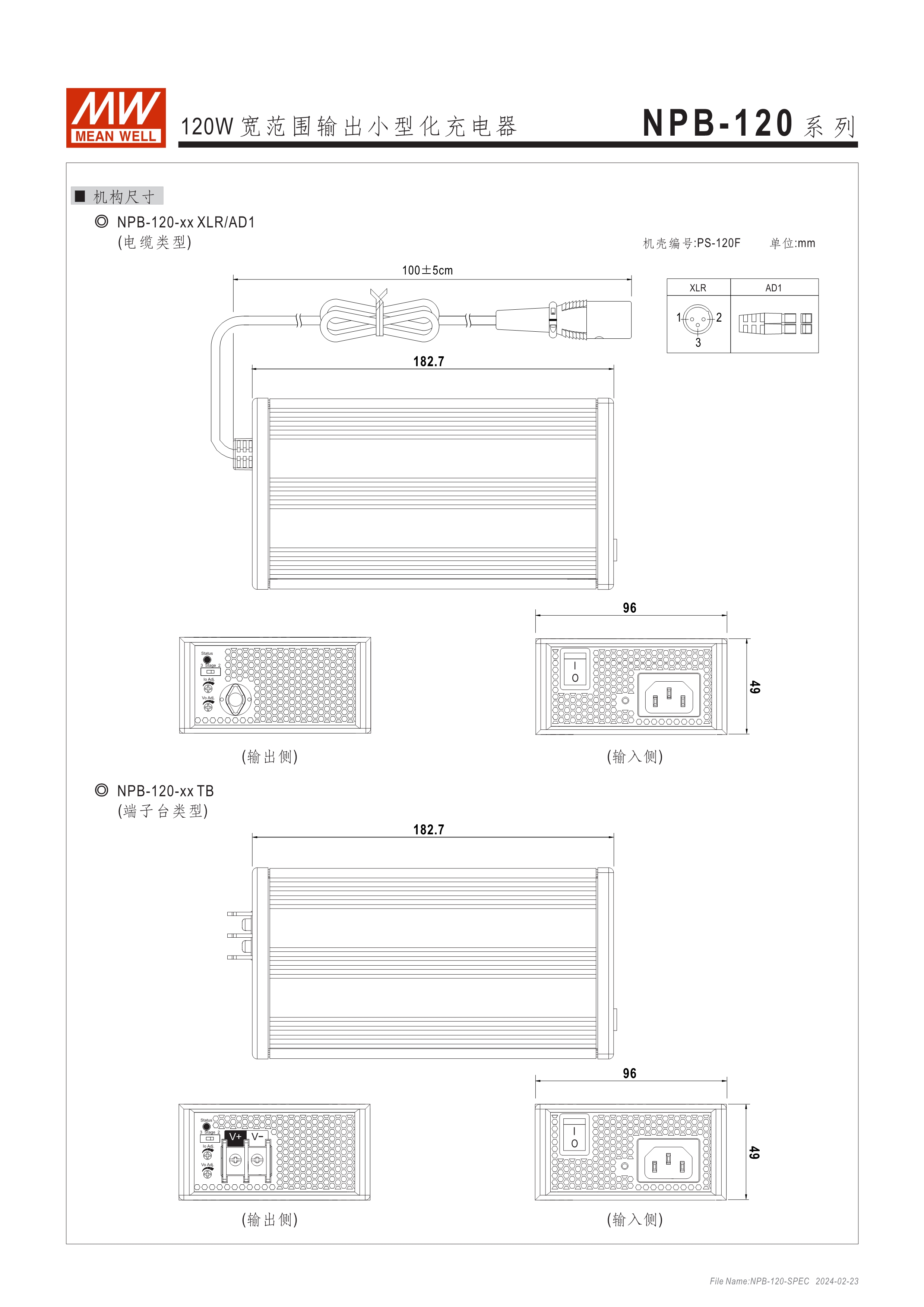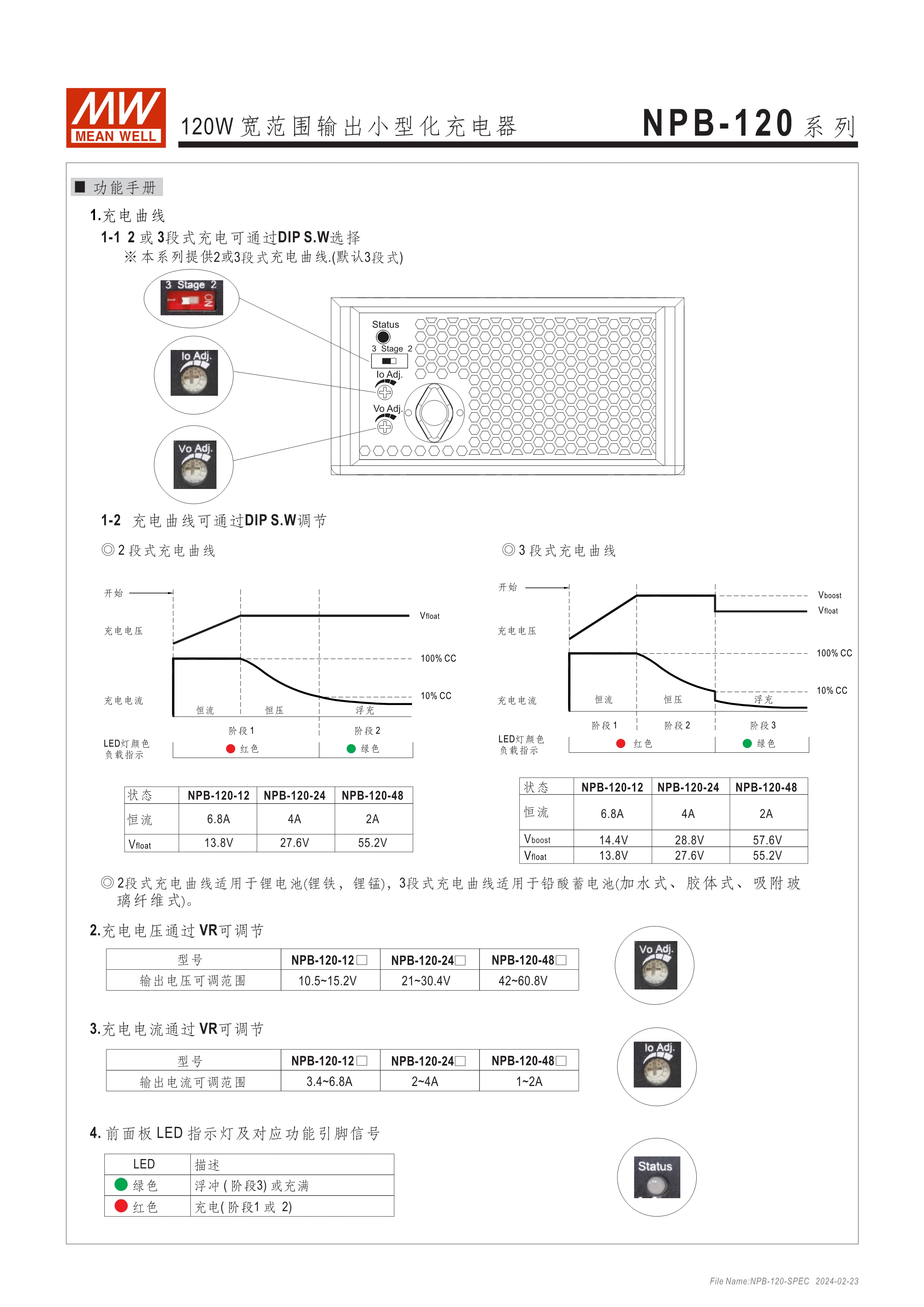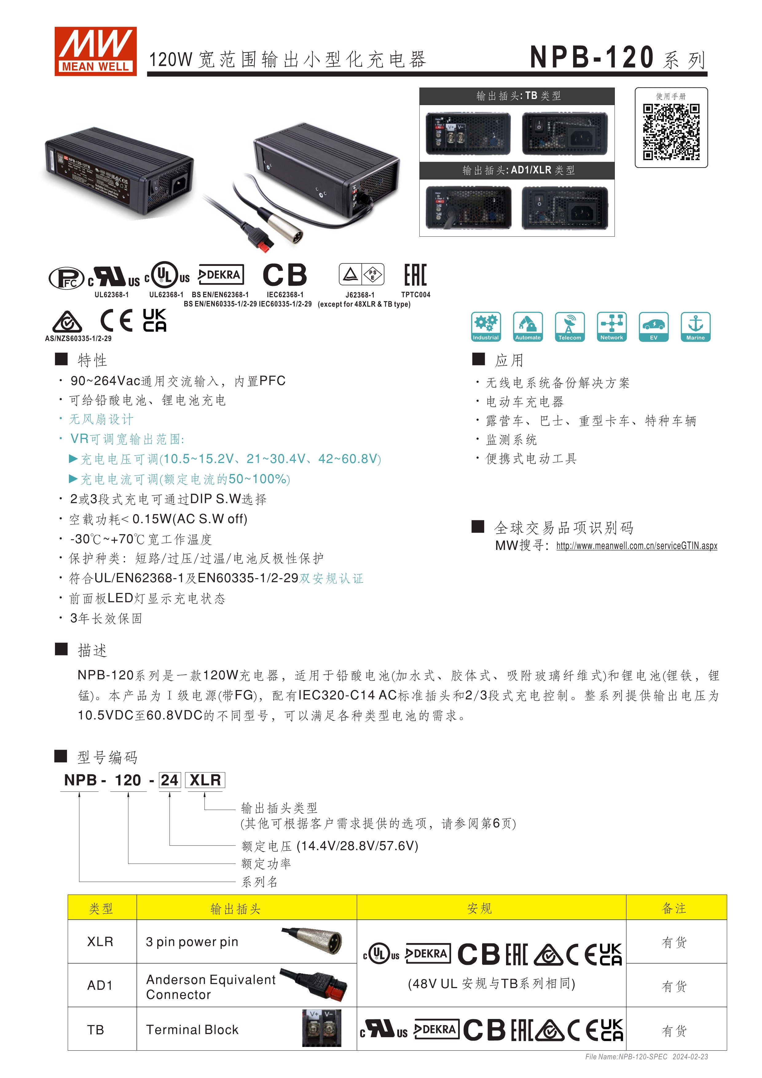 基礎(chǔ)型可靠耐用寬壓充電器 金屬殼散熱快、使用不燙手 可調(diào)功能簡(jiǎn)便、使用彈性高: ? 可調(diào)充電電壓 (由面板調(diào)整10.5~15.2V, 21~30.4V, 42~60V) ? 可調(diào)充電電流 (由面板VR調(diào)整50~100%) ? 透過面板DIP Switch可選2段或3段充電 保護(hù)功能:短路、過壓、過溫度、電池反極性保護(hù) 通過UL/EN62368-1及IEC60335-1/2-29雙安規(guī)認(rèn)證 DC輸出接頭多樣可選:Anderson、麥克風(fēng)頭、端子臺(tái) 3年保固