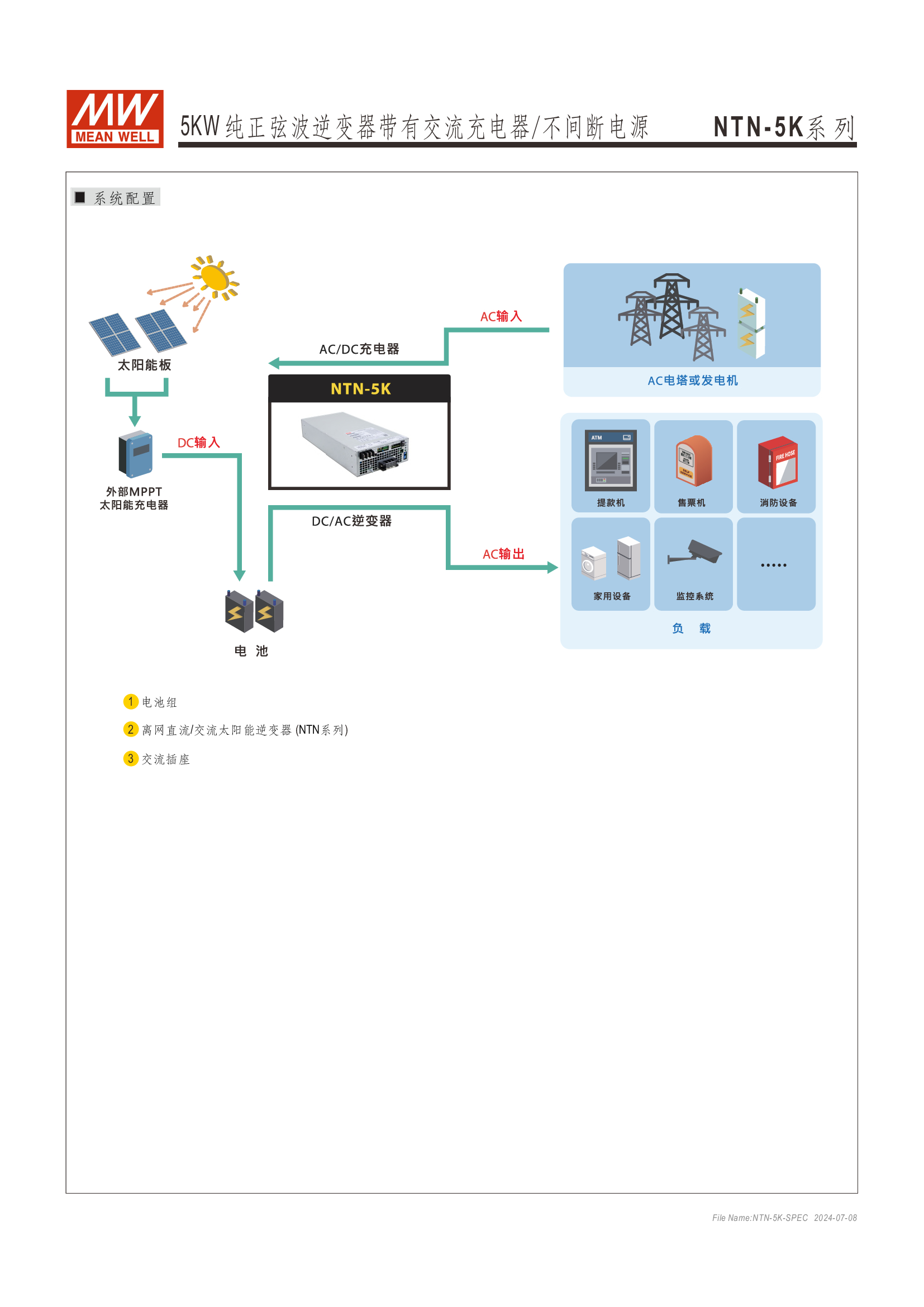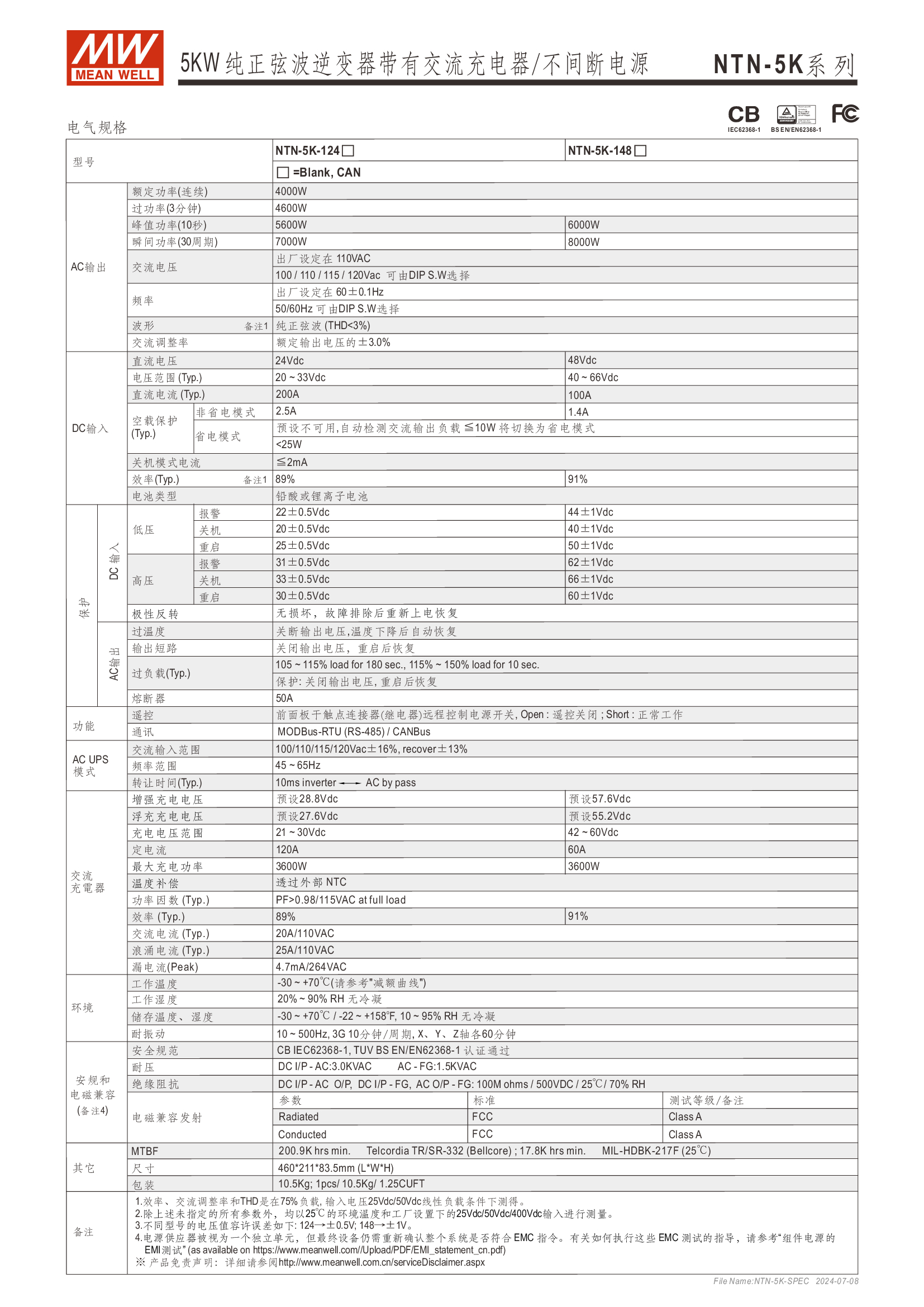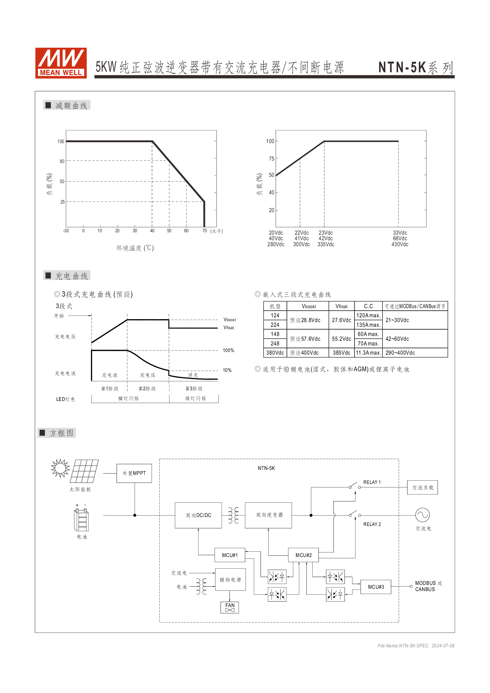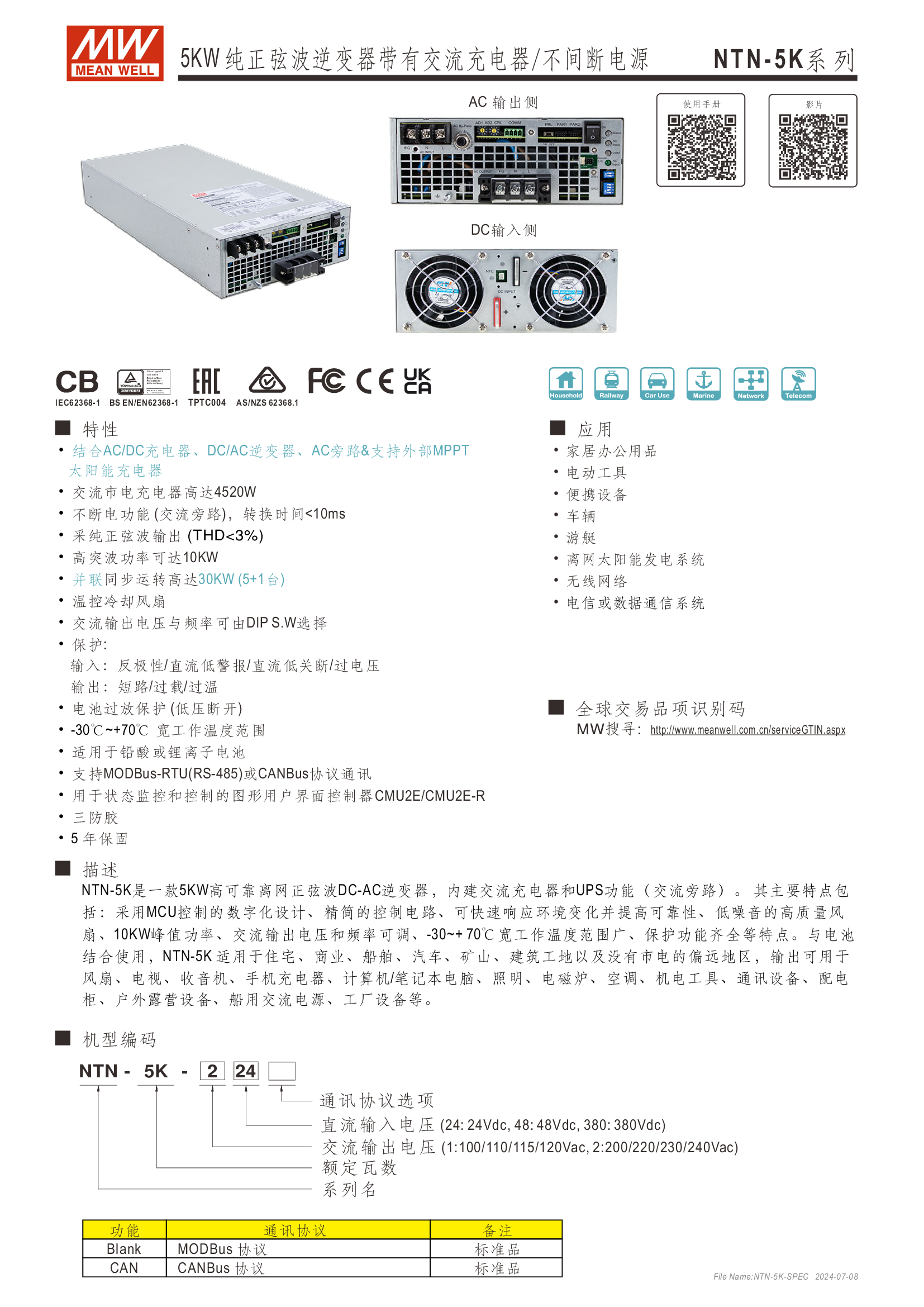 多功能一體機 (AC-DC 充電器 + DC-AC 逆變供載 + AC 旁路供載) AC 市電充電最高可達 135A /4KW 可提供瞬間功率達 10KW 并聯(lián)同步運行高達 30KW(5+1 機組) 多重智能保護功能: 直流輸入:極性反接/ 低壓告警與關(guān)機/ 過壓 /電池過放電保護 交流輸出:短路/ 過載/ 過溫 內(nèi)建 MODBus 或 CANBus 通訊監(jiān)控 5 年保固