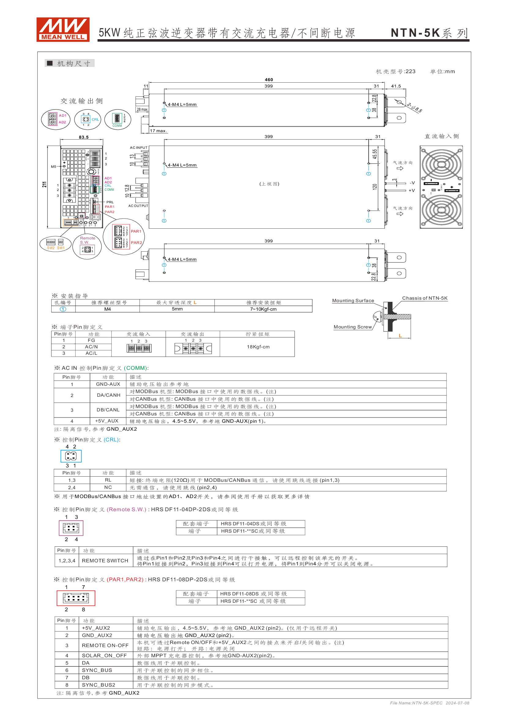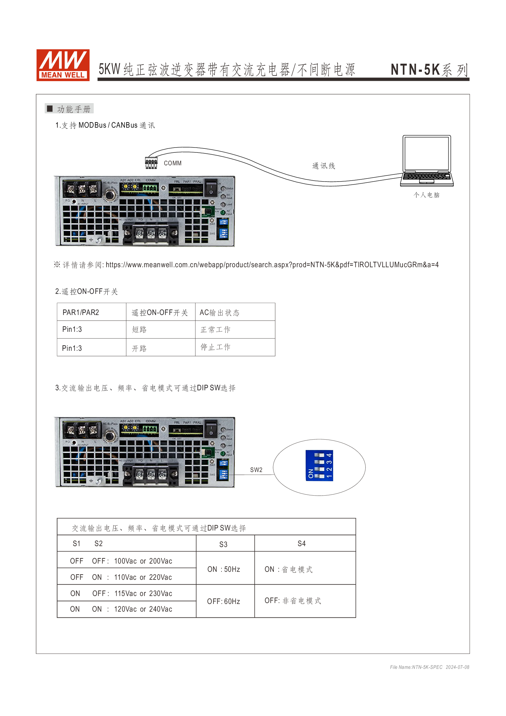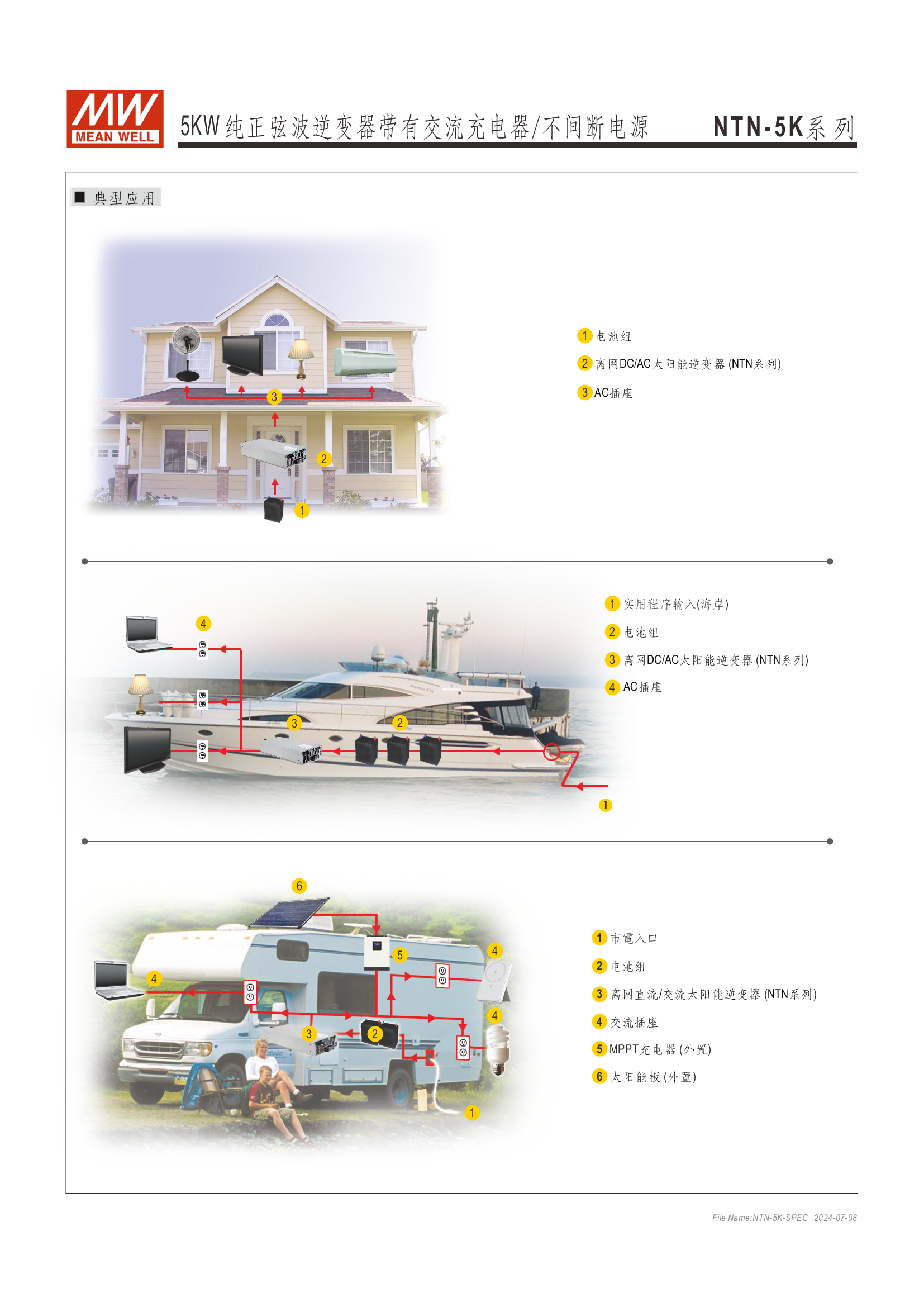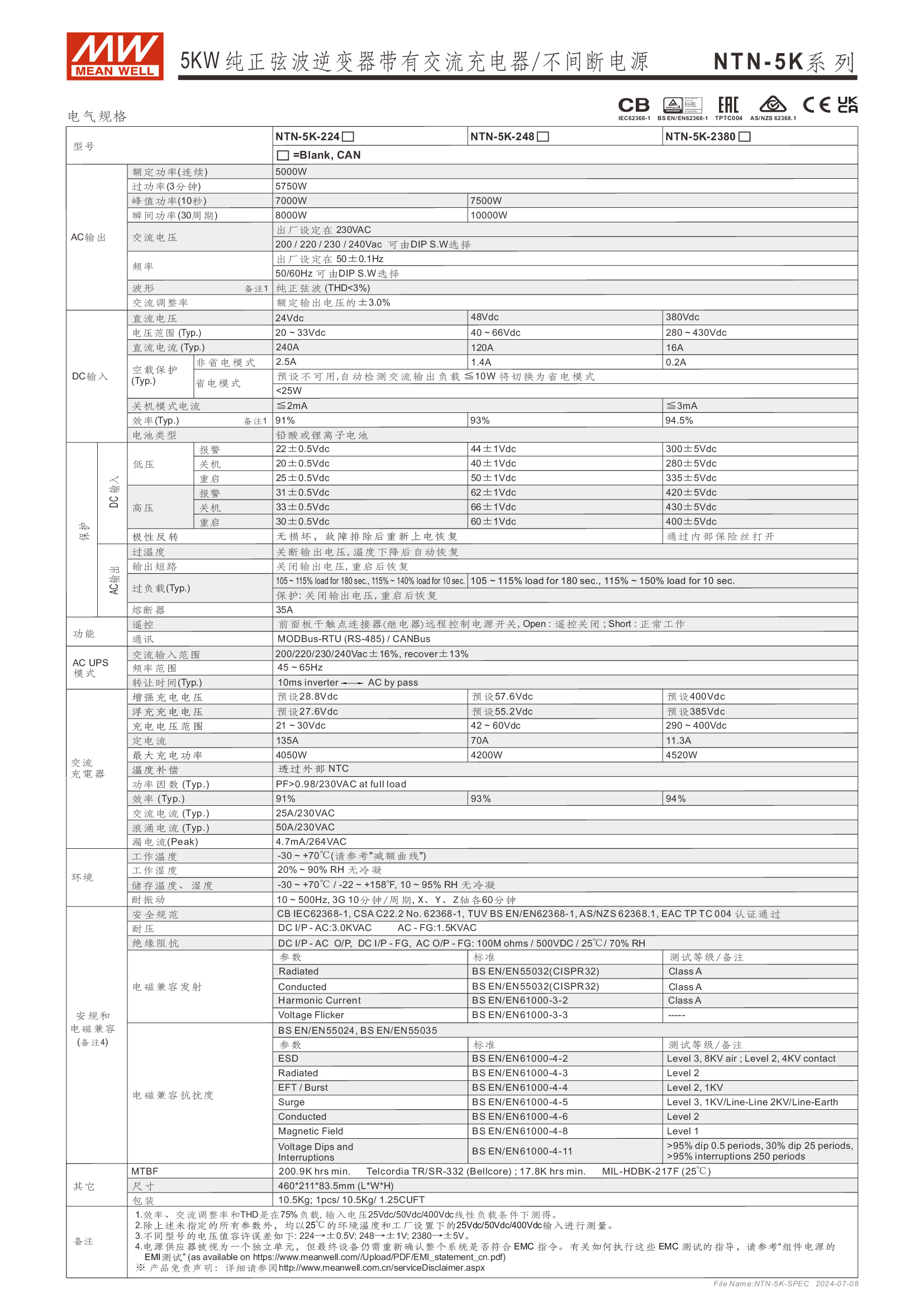 多功能一體機 (AC-DC 充電器 + DC-AC 逆變供載 + AC 旁路供載) AC 市電充電最高可達 135A /4KW 可提供瞬間功率達 10KW 并聯(lián)同步運行高達 30KW(5+1 機組) 多重智能保護功能: 直流輸入:極性反接/ 低壓告警與關(guān)機/ 過壓 /電池過放電保護 交流輸出:短路/ 過載/ 過溫 內(nèi)建 MODBus 或 CANBus 通訊監(jiān)控 5 年保固