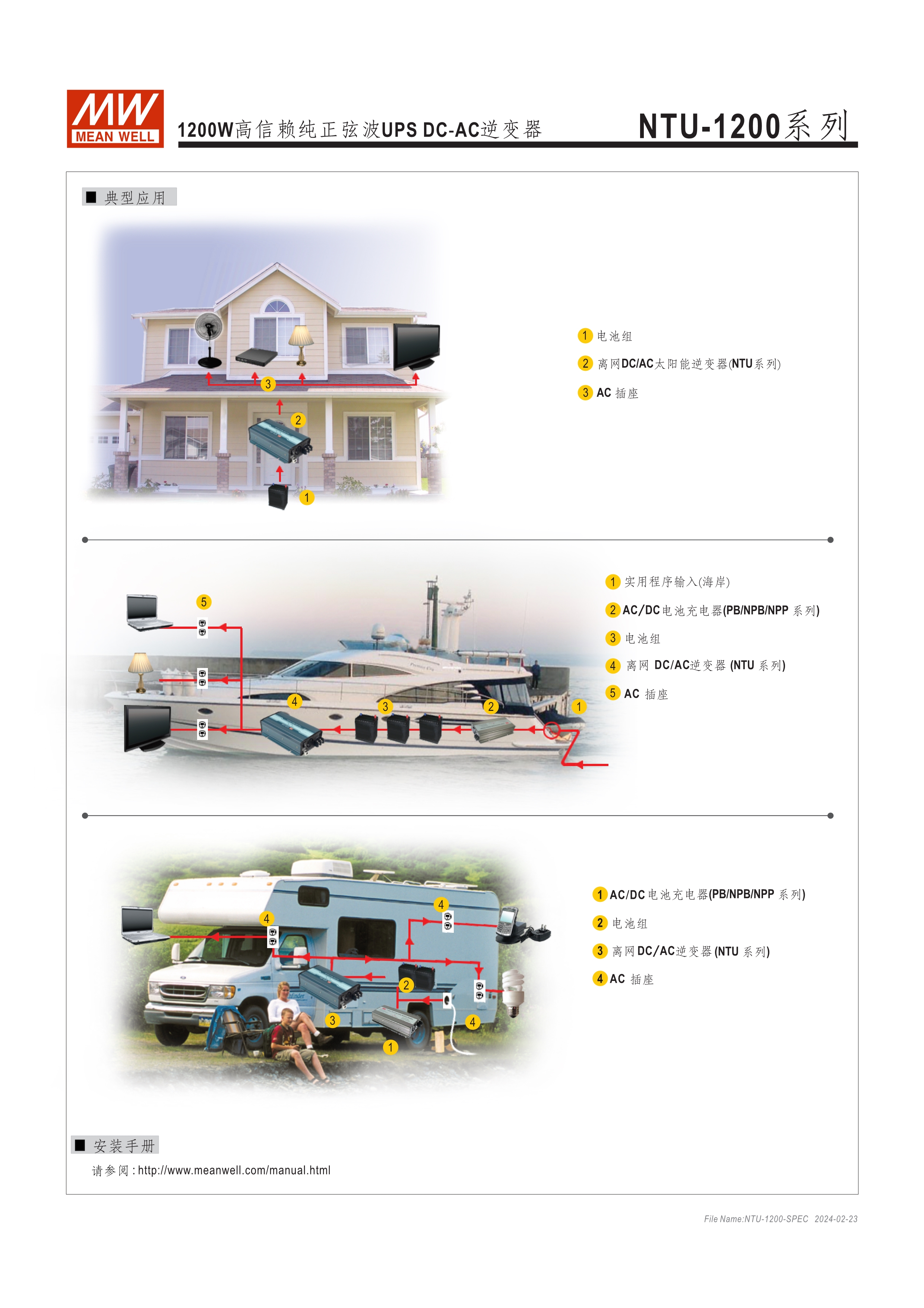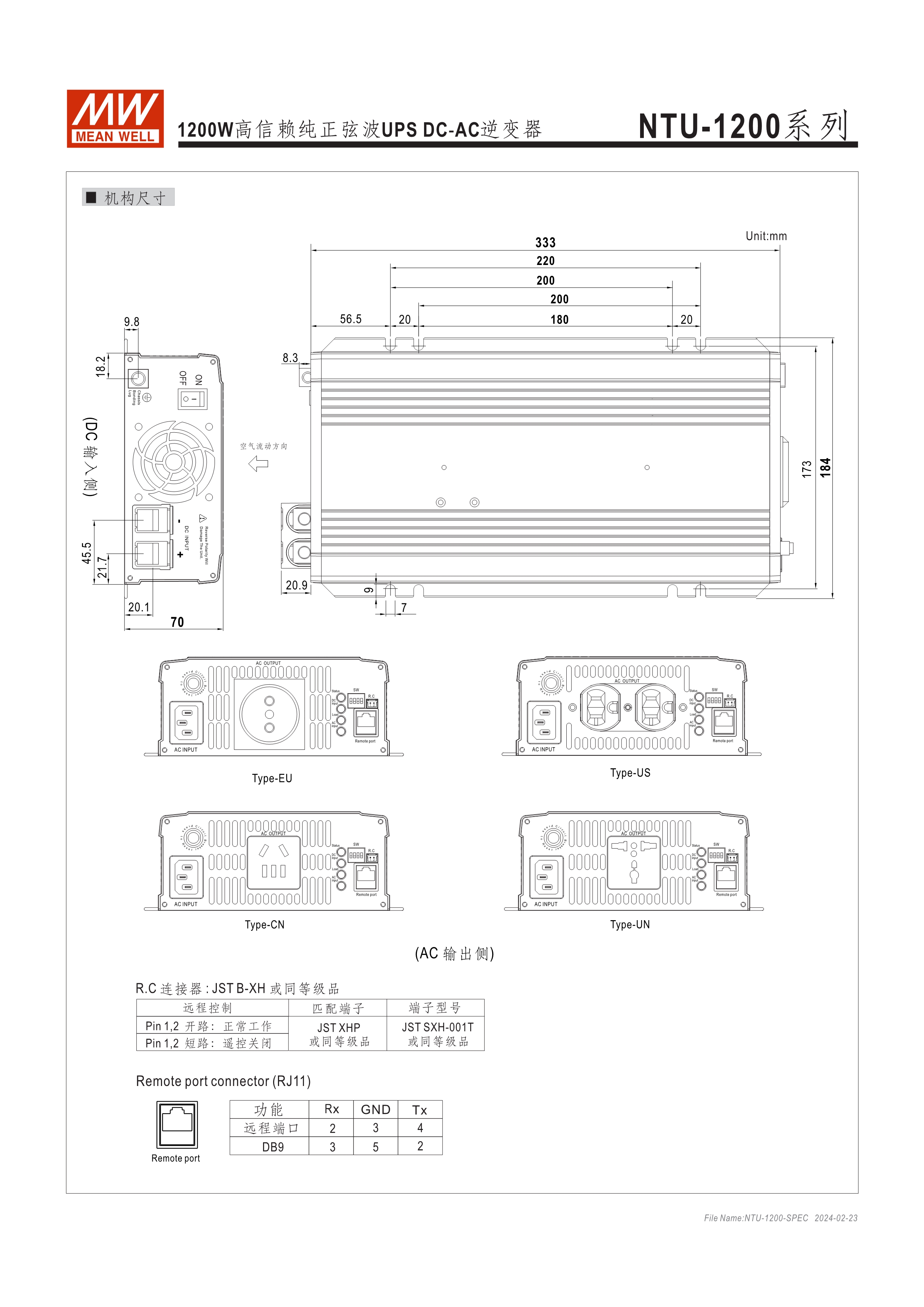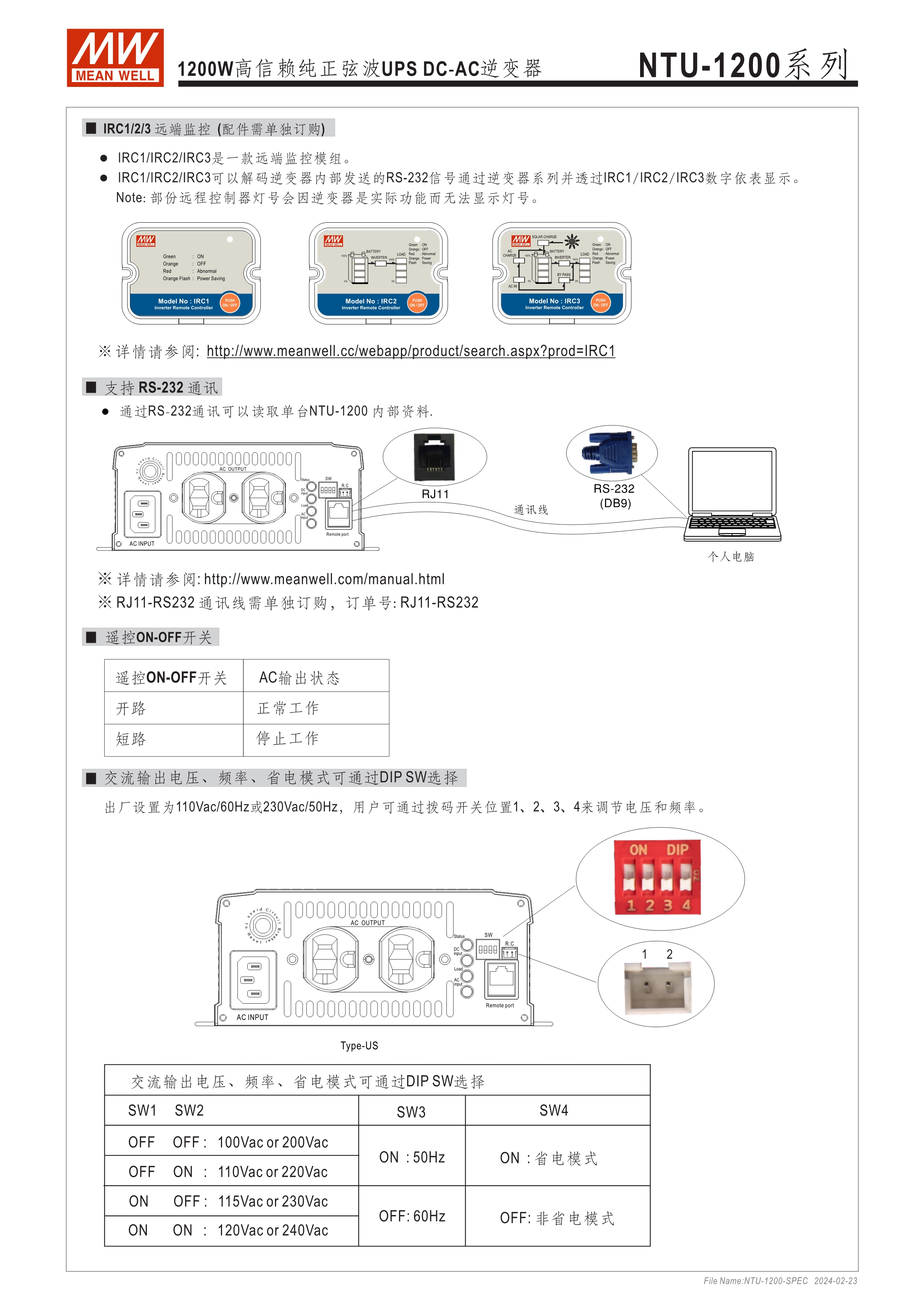 內(nèi)置UPS功能(交流旁路) DC-AC純正弦波輸出 (THD<3%) 可遠距遙控 (IRC1, IRC2, IRC3) 多重智能保護功能: DC輸入側(cè) - 極性反接、電壓過低、電壓過高保護 AC輸出側(cè) - 短路、超載、過熱保護