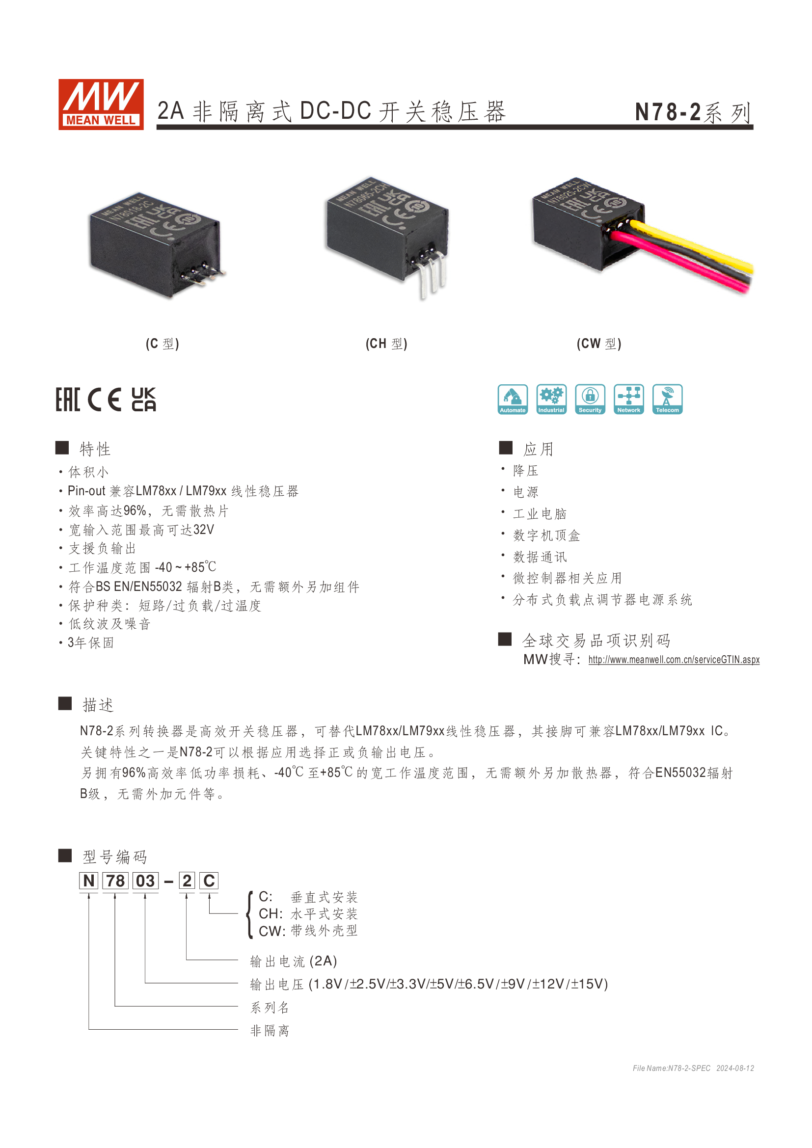 Pin-out 兼容 LM78xx/LM79xx 線性穩(wěn)壓器 效率高達(dá) 96%、無須散熱片 寬輸入范圍最高可達(dá) 32V 支援負(fù)輸出 工作溫度范圍:-40 ~ +85oC 符合 BS EN/EN55032 輻射 B 類、無需另加組件 保護(hù)種類:短路/過負(fù)載/過溫度 3 年保固