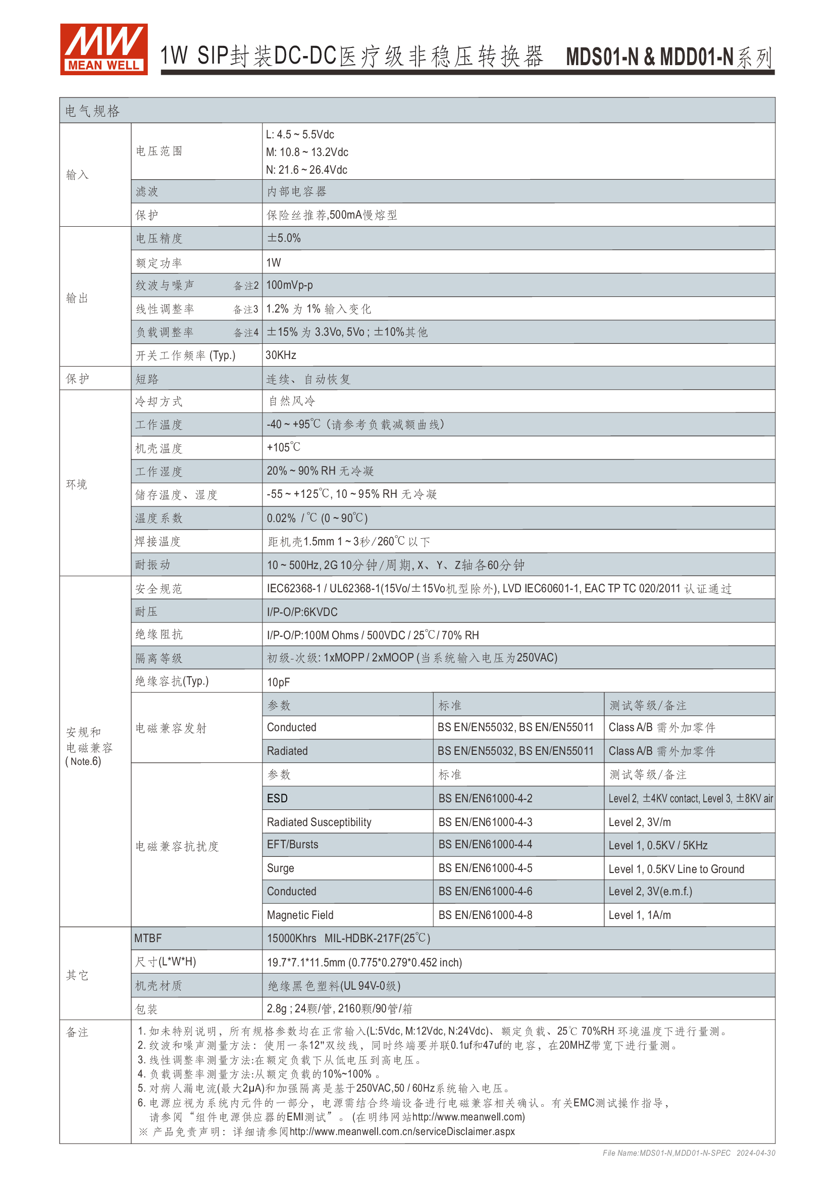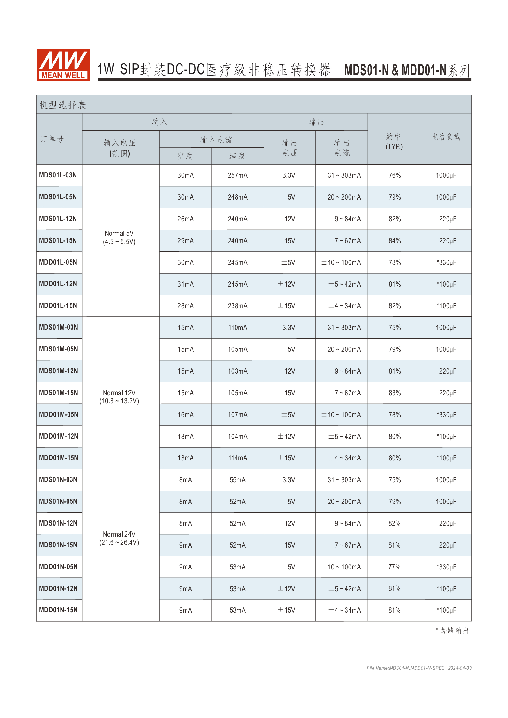 模塊型快選表 SIP7 單排封裝國際標(biāo)準(zhǔn)引腳 (1~3W); DIP24 單排封裝國際標(biāo)準(zhǔn)引腳 工作溫度:-40 ~ +90℃ (不需降載) 通過醫(yī)療認(rèn)證ANSI/AAMI ES60601-1 (1×MOPP/2×MOOP) 超低病患泄漏電流 <2μA(1~3W); 超低病患泄漏電流 <5μA (3~6W) 保護(hù)功能:短路保護(hù)(3秒) / 過負(fù)載保護(hù) (3~6W) 3年保固期