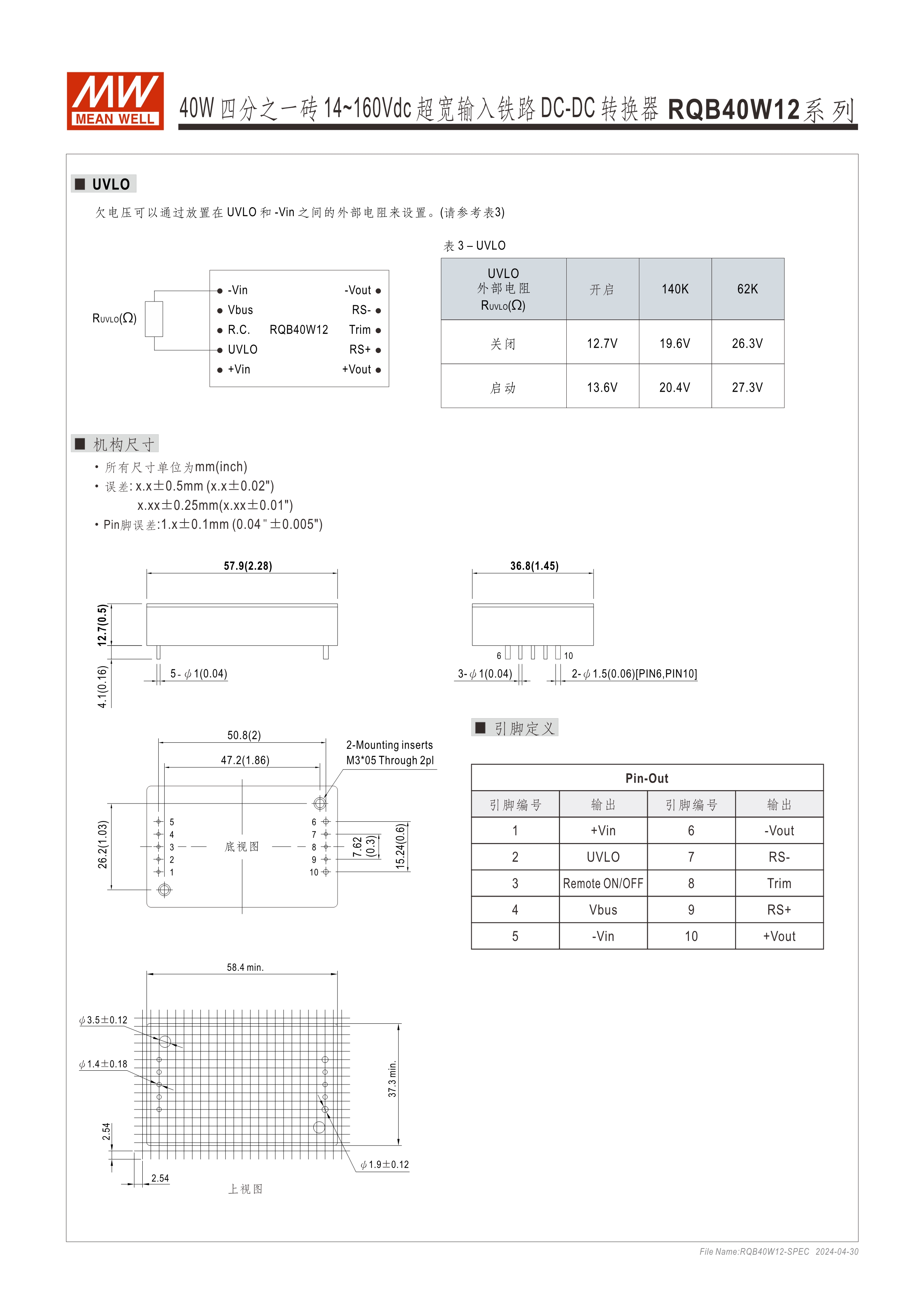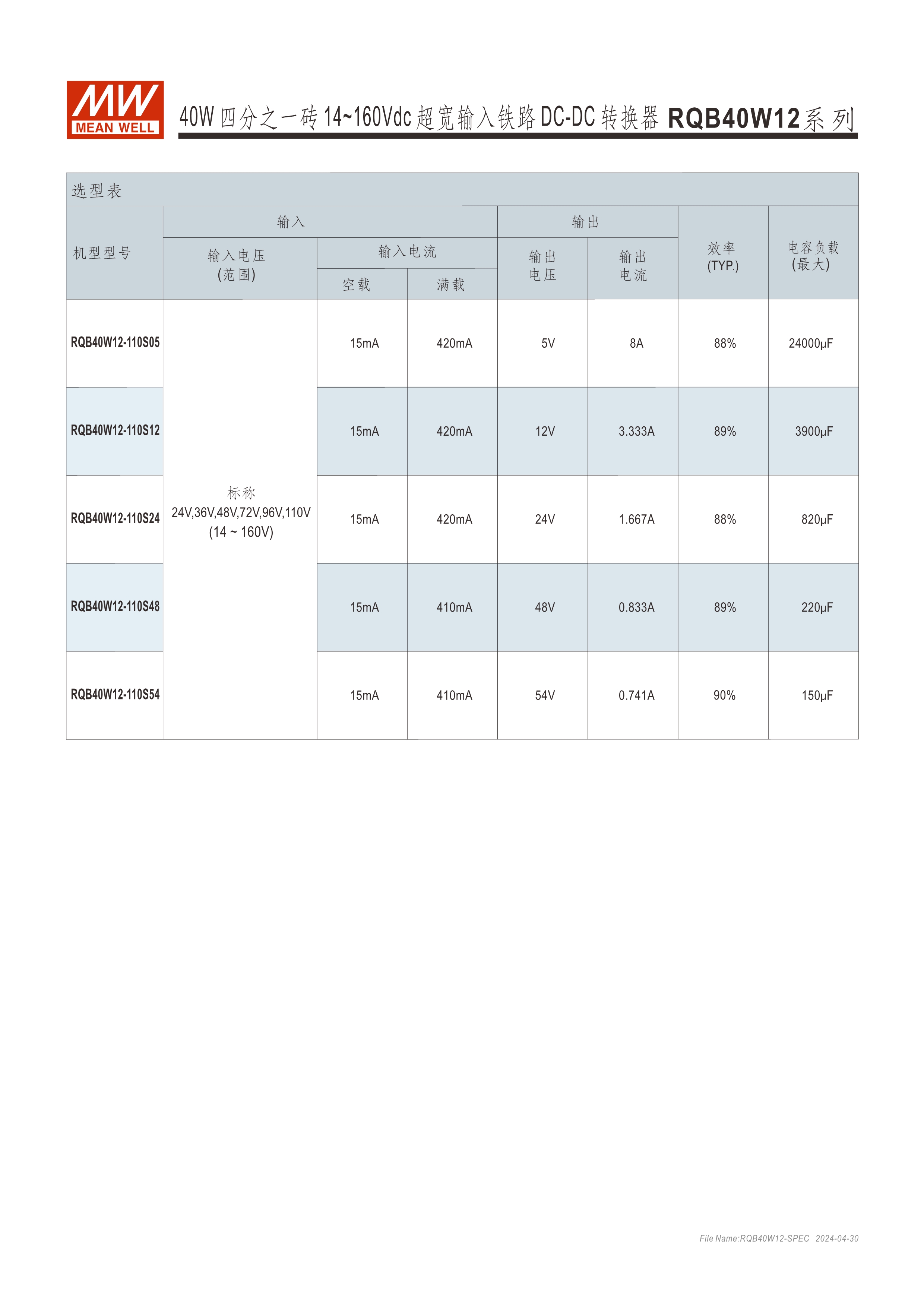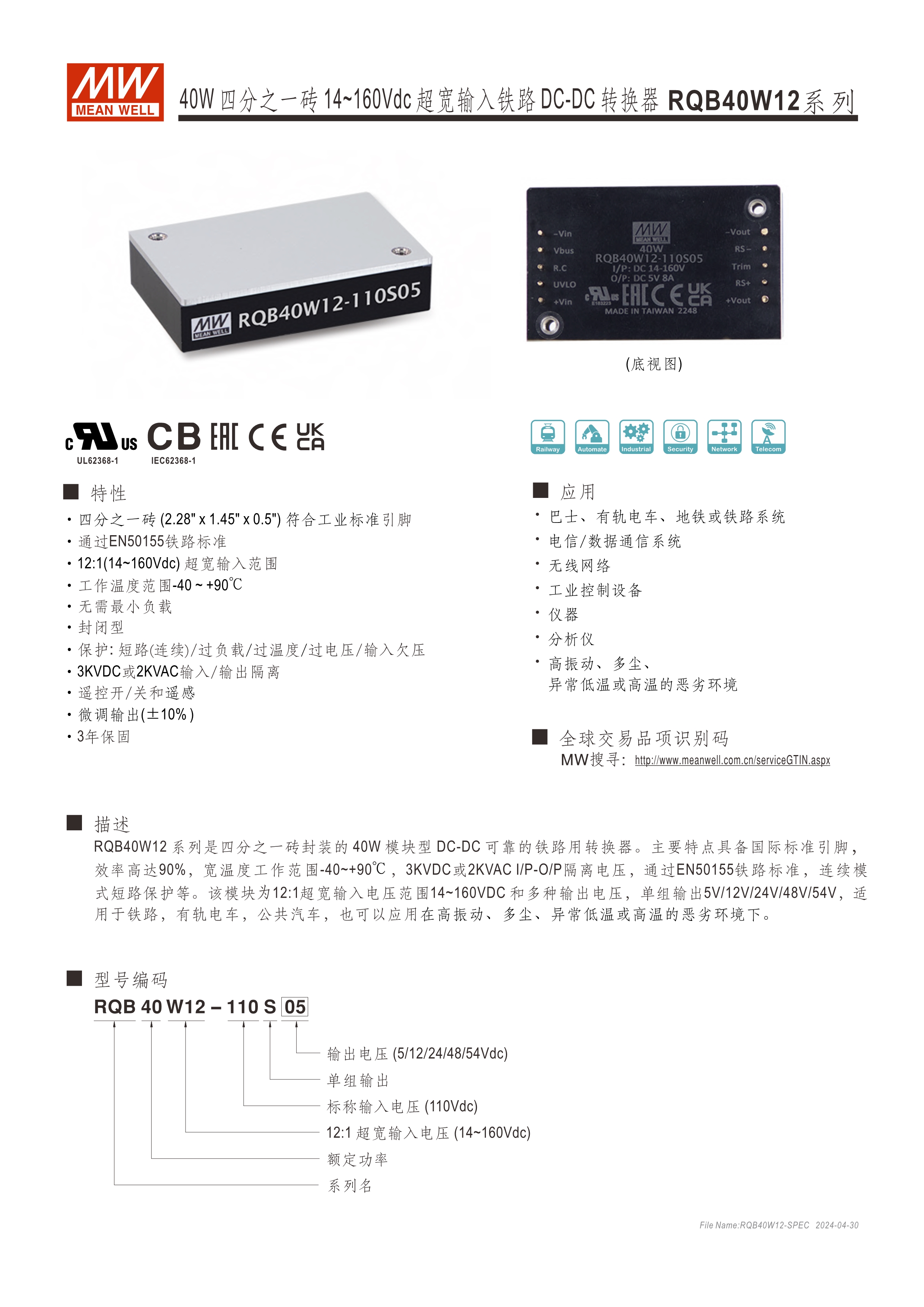 模塊型快選表 2.28” x 1.45” x 0.5”半磚尺寸 符合鐵路標準EN50155 40W: 12:1(14~160Vdc)超寬輸入范圍 ; 150W: 3:1(60~160Vdc)超寬輸入范圍 寬工作溫度范圍-40~+90oC 無需最低負荷 全封裝
