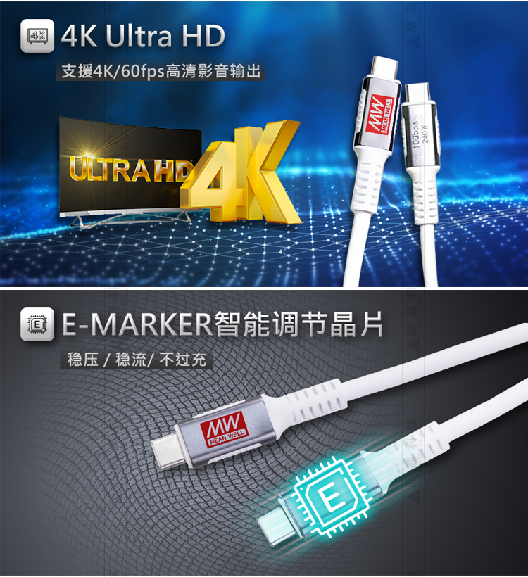 USB傳輸線 明緯聯(lián)源精密USB 3.2 GEN2 Type C 240W充電/傳輸線